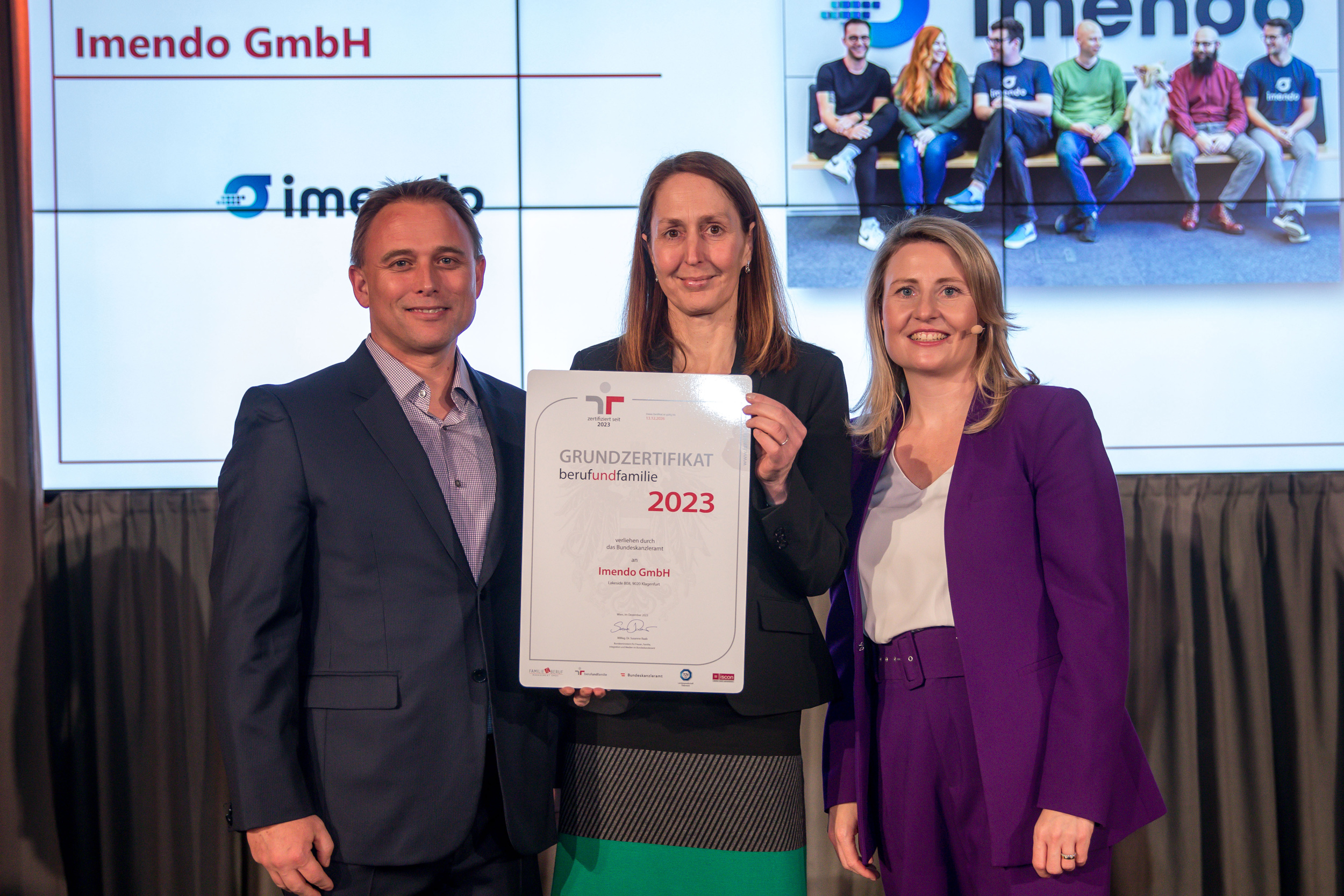 Unsere Leidenschaft und Hands-on-Mentalität wurden schon vielfach ausgezeichnet. Imendo ist unter anderem Gewinner des “Austria’s Leading Companies”-Awards 2022, des bedeutendsten Wirtschaftspreises in Österreich. Dazu ist es tief in der Unternehmens-DNA verankert, jeden Tag ein noch besserer Arbeitgeber zu werden. Denn Fakt ist: Eine wertschätzende, respektvolle und familiengerechte Arbeitsumgebung steigert die Zufriedenheit, Leistungsfähigkeit und Innovationskraft unserer Mitarbeiter:innen. Deshalb sind wir auf das staatliche Gütezeichen "berufundfamilie“ besonders stolz. Es unterstreicht, wie sehr unsere familienfreundliche Personalpolitik von den knapp 100 Imendees an den zwei Standorten in Klagenfurt und Wien gelebt und geschätzt wird. Dabei ist uns jede Definition von Familie willkommen - ob Lebenspartner:in, Kinder, vierbeinige Begleiter oder der engste Freundeskreis.